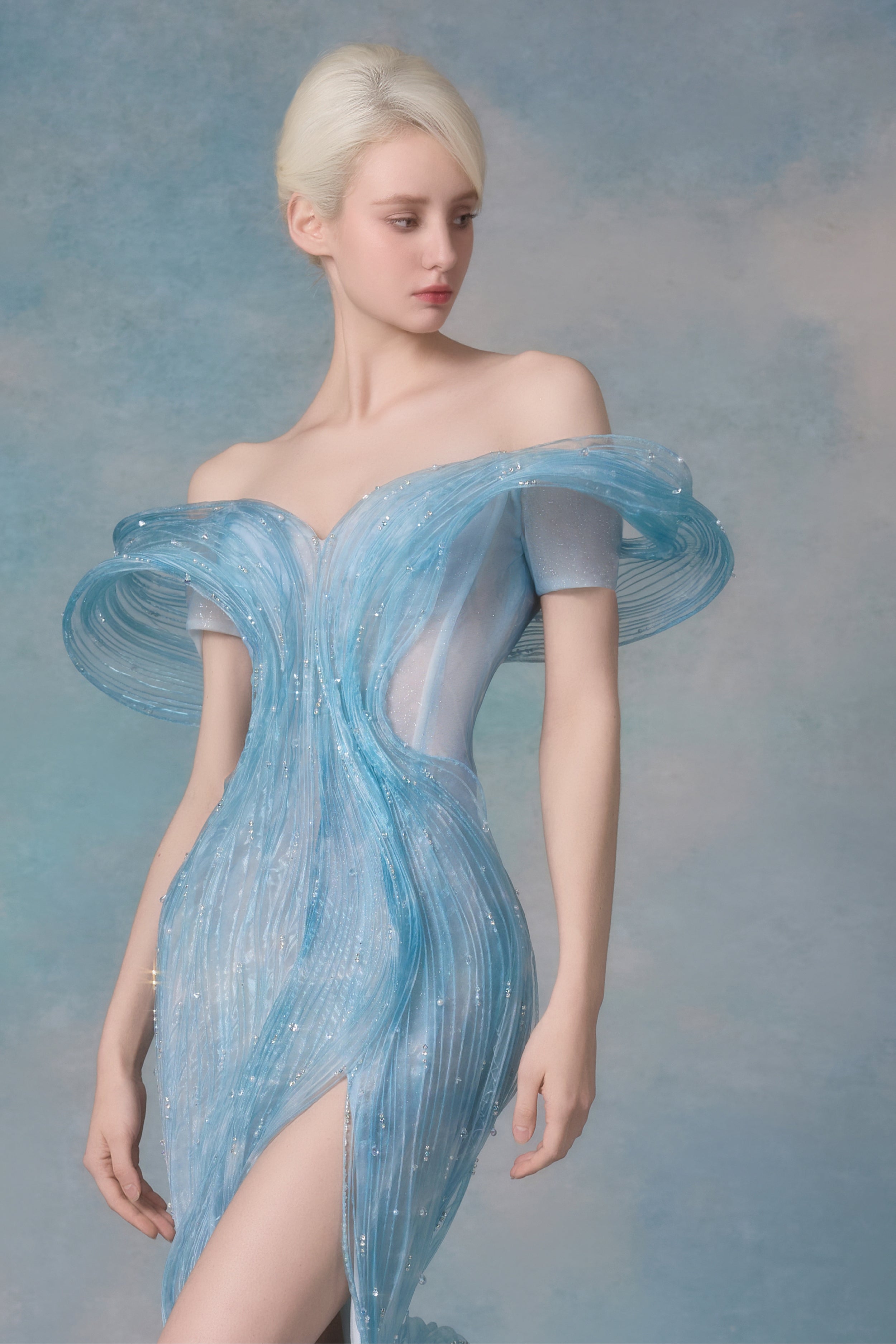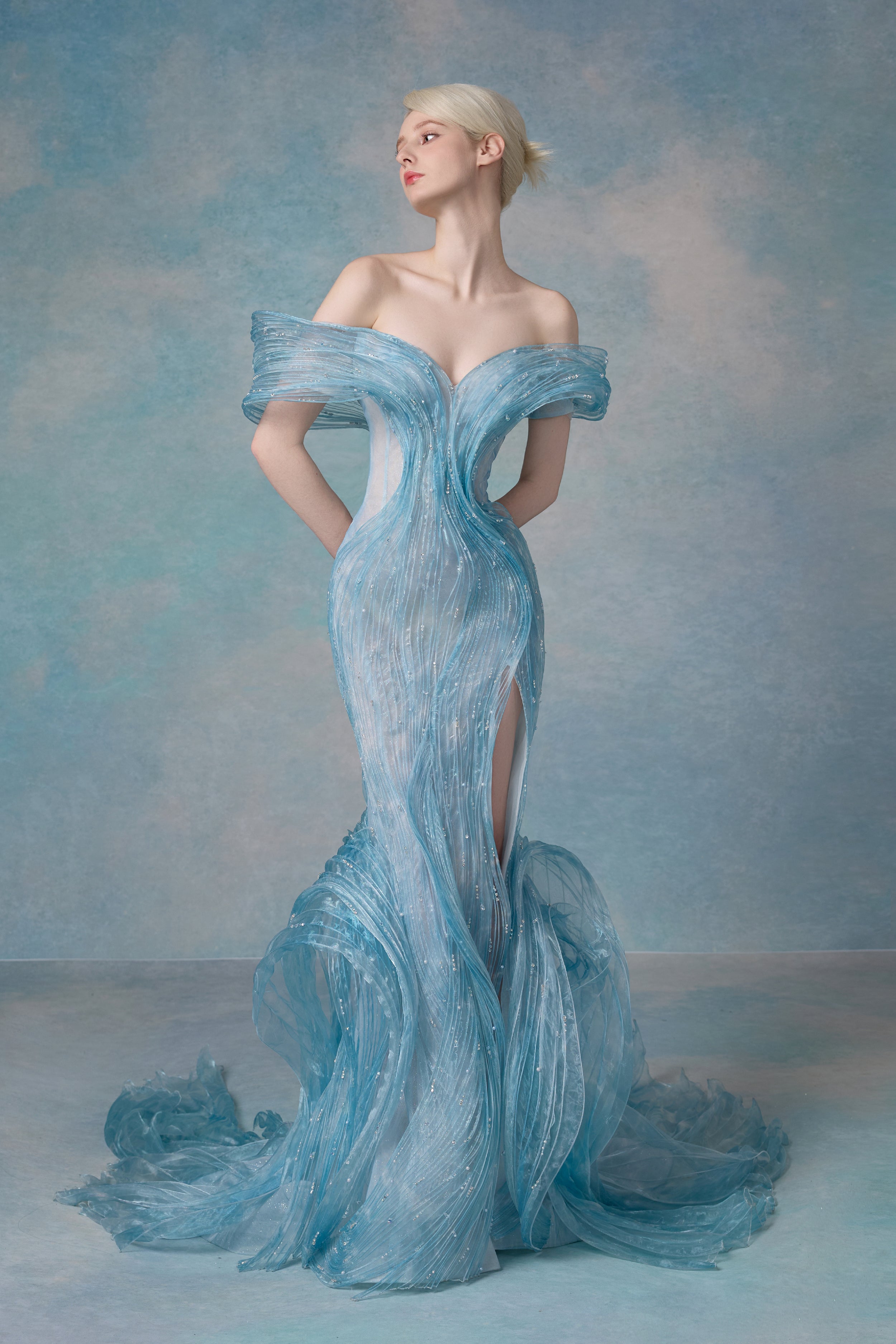 An eye-catching mermaid style gown featuring an off-shoulder fish-bone corset that beautifully sculpts the silhouette. Crafted with light and airy tulle fabric and enhanced with intricate embellishments, it creates a refined three-dimensional look with luminous depth.