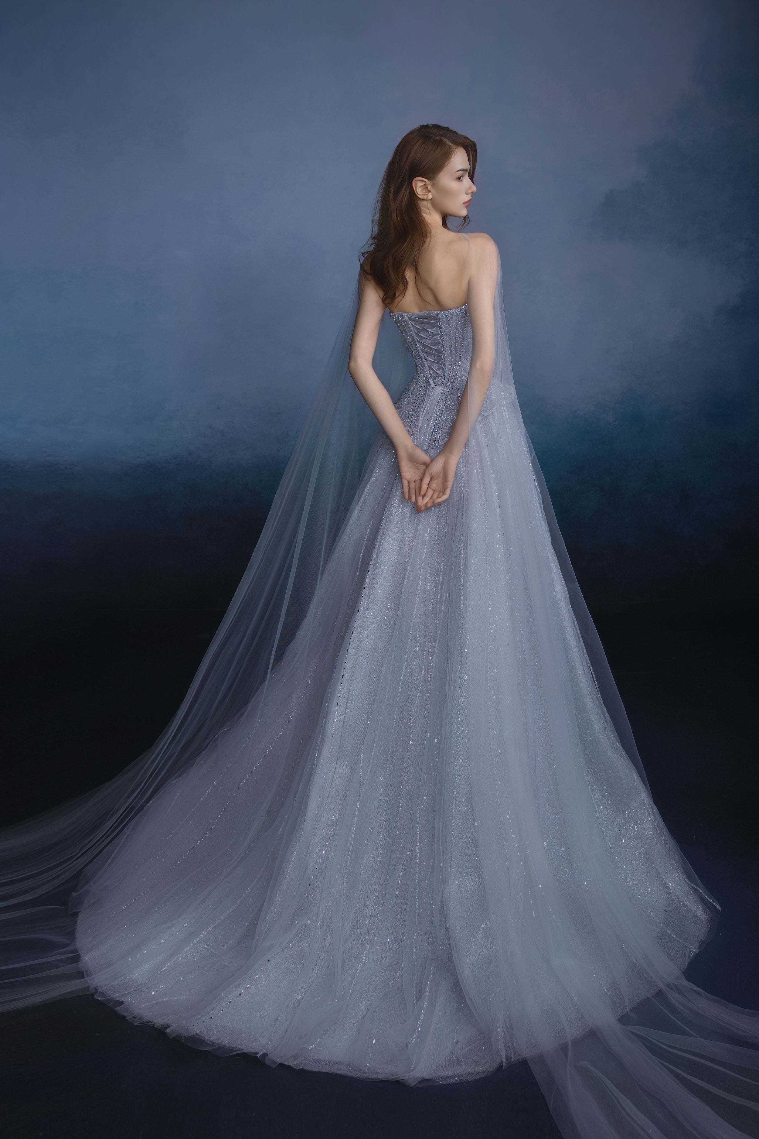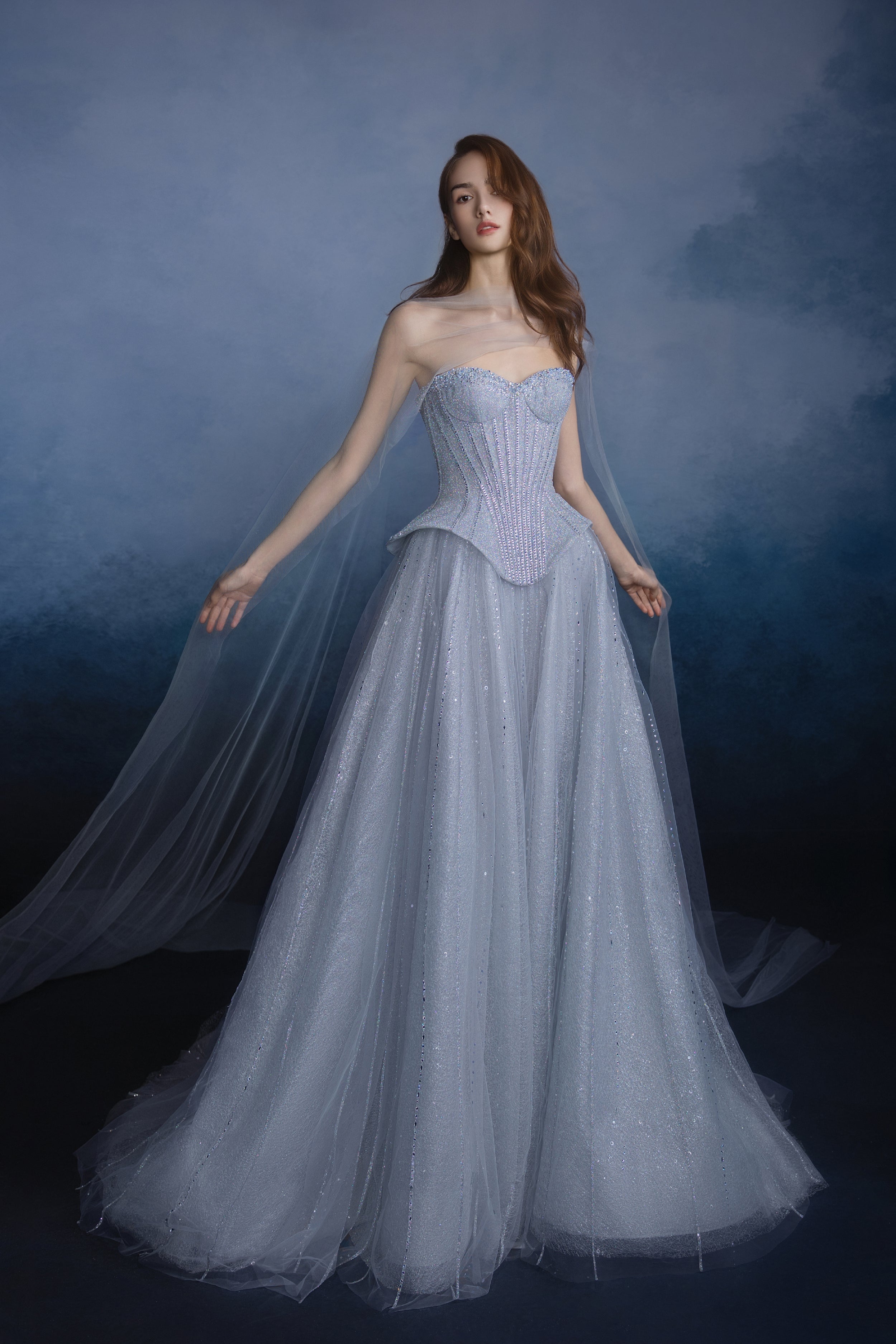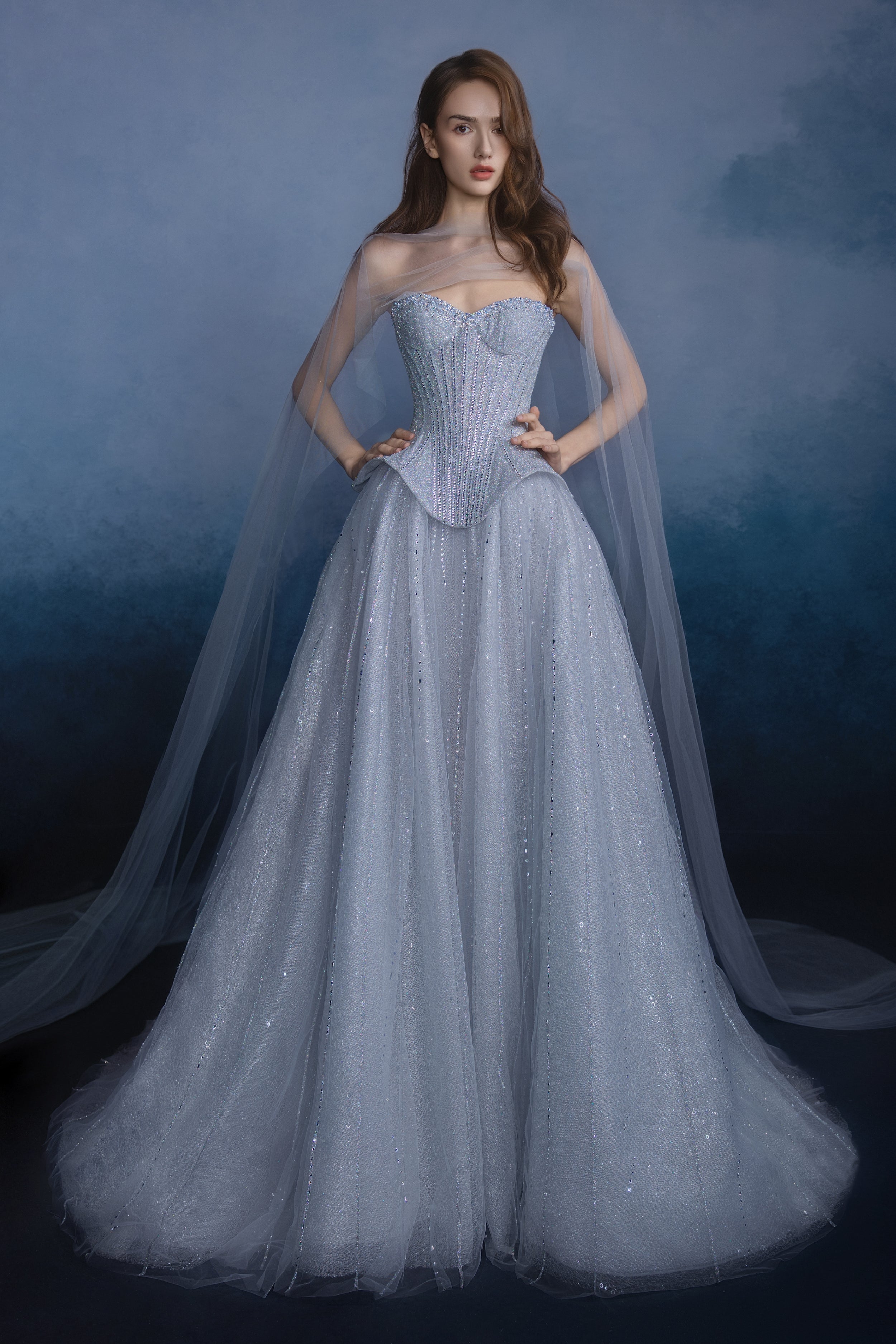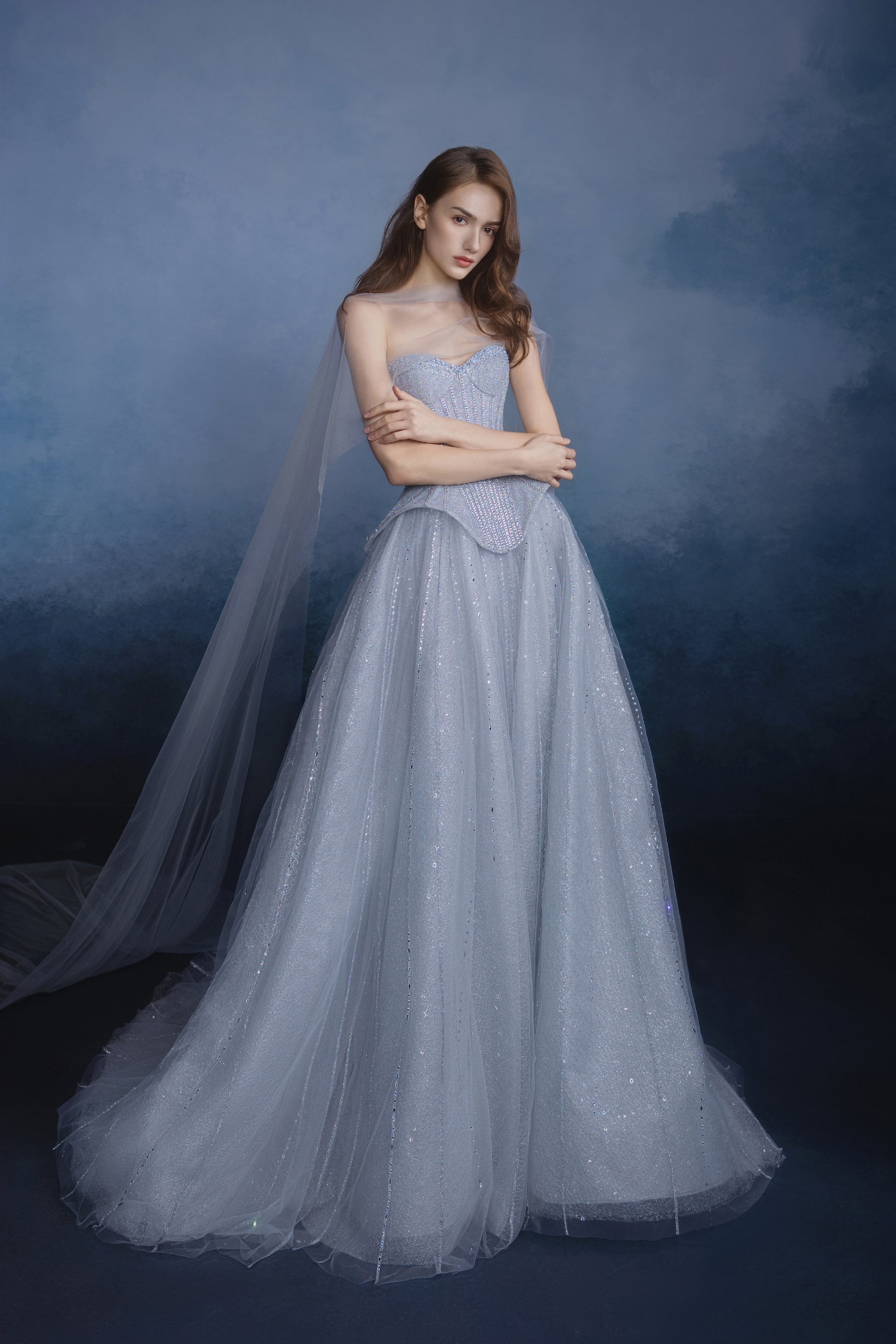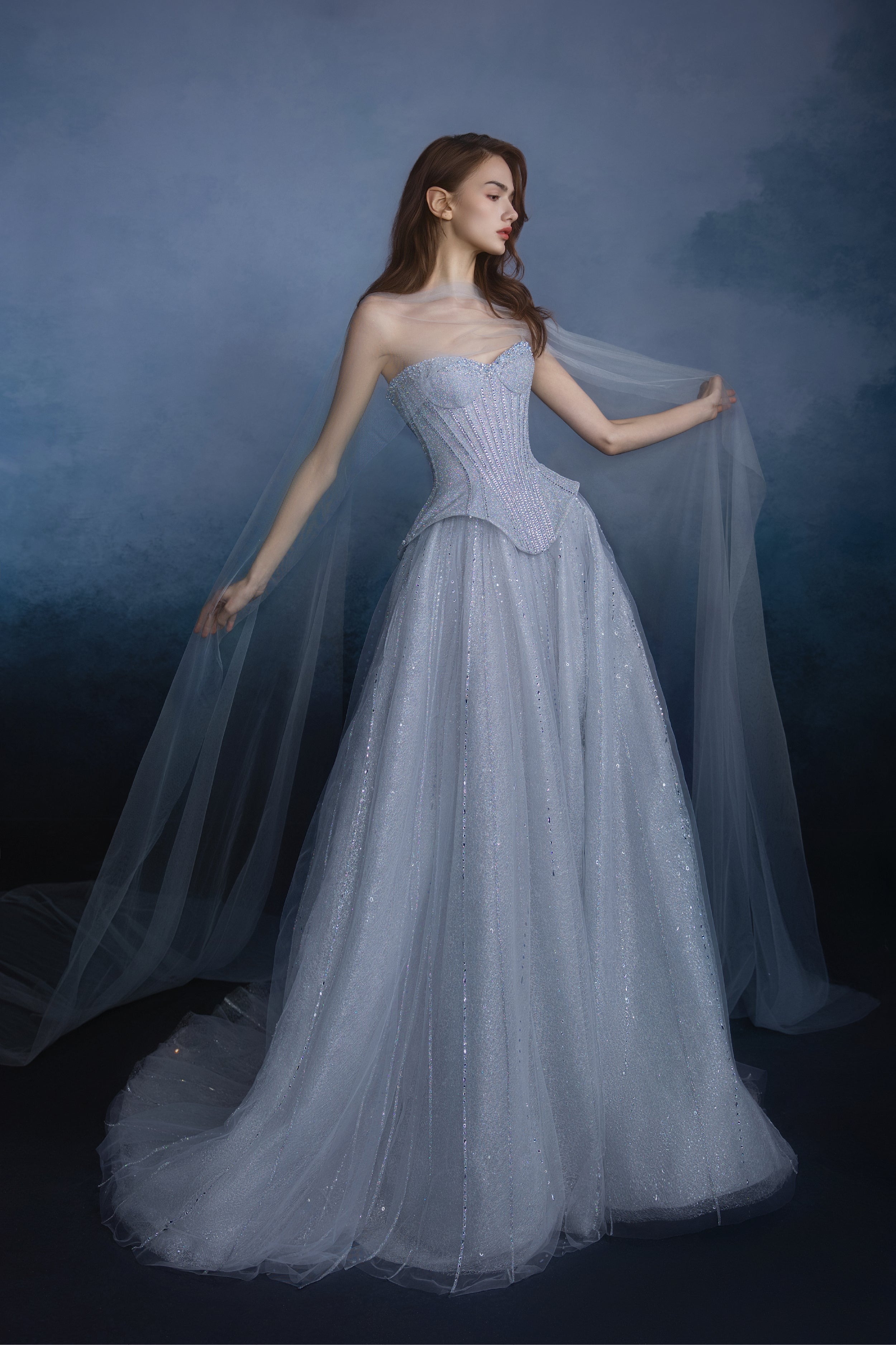 Features a structured corset that sculpts a poised, elegant silhouette. Crafted from shimmering fabric, the gown drapes like a cascade of stardust, accented by hand-sewn beads and rhinestones that capture the brilliant mystique of the galaxies.